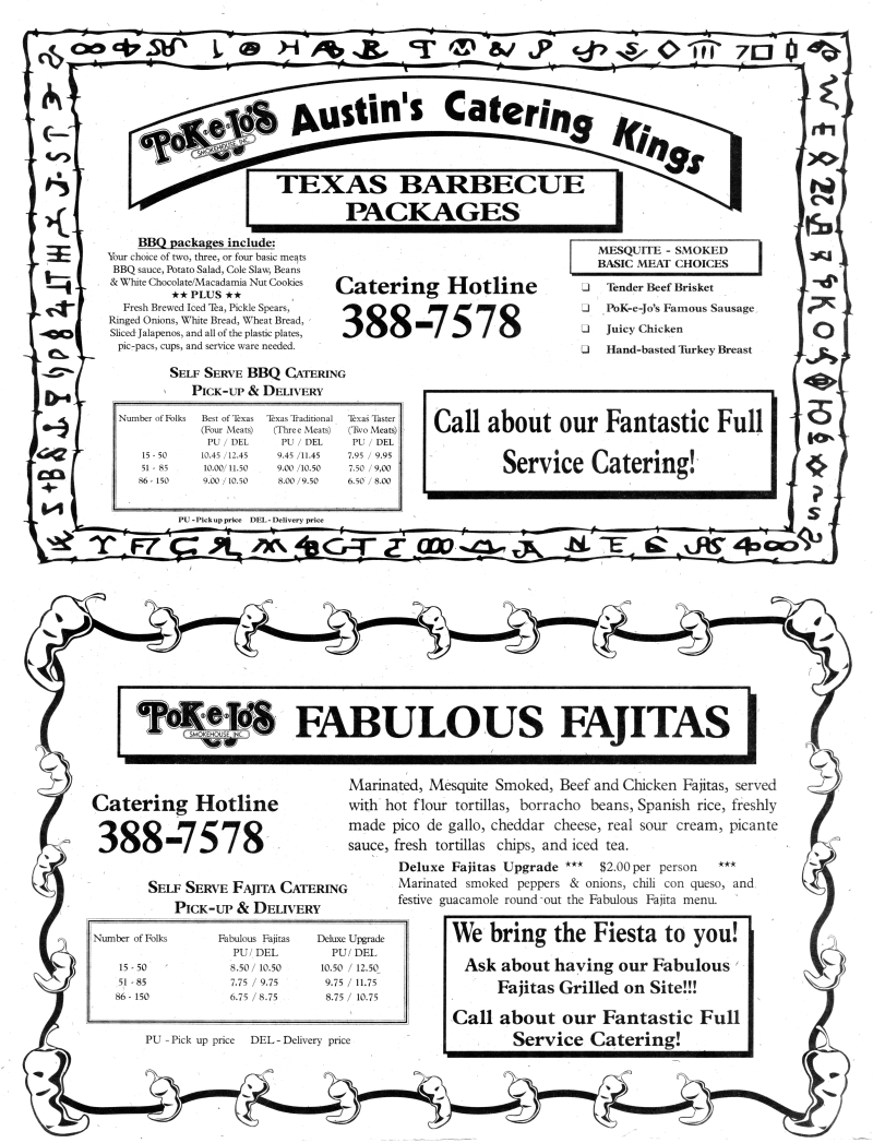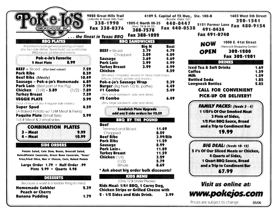 KEYWORDS: SERVICES: In-House, Pick-Up, Catering Pok, Jos, BBQ, Barbeque, Chopped, Sliced, Trimmed, Homemade, Beef, Chicken, Turkey, Pork, Sausage, Ribs, Loin, Spud, Burger, Corny Dog, Cobbler, Pudding,